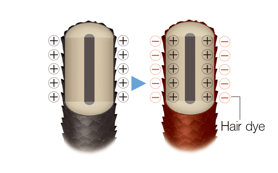 Acid dye with negative ion is bonded to the hair surface with positive ion to dye hair. Moreover, a part of the dye enters the interior of the hair due to the effect of the penetrant.