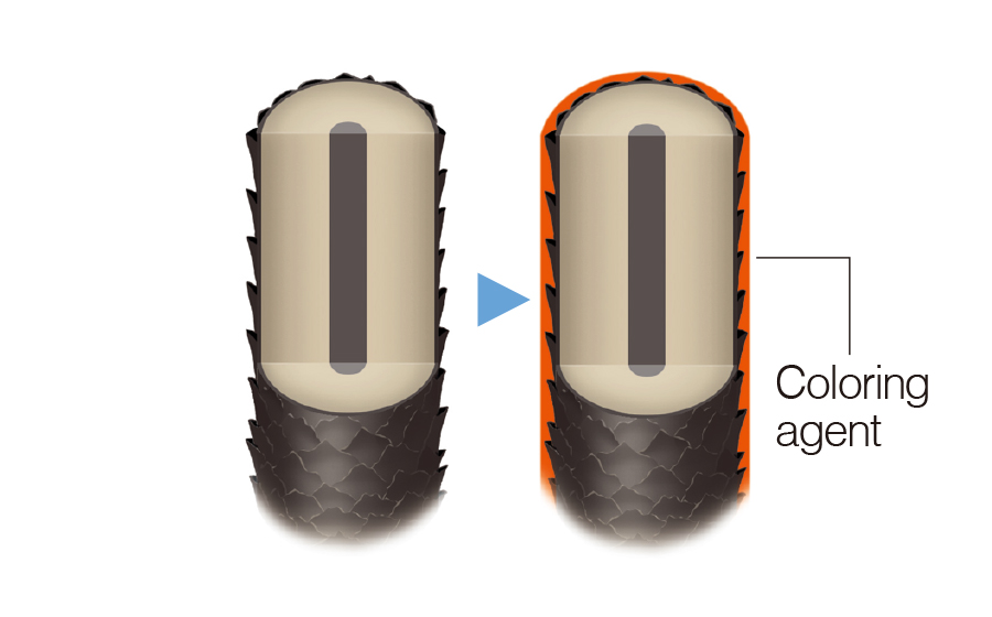 The cuticles open by swelling effect of alkali, and the ingredients permeate into the hair. Hydrogen peroxide degrades melanin pigment to decolorize, and dye adheres with hydrogen peroxide to develop color. However, the turn color makes hair darker instead of making brighter (tone down effect) because it hardly bleaches the hair.